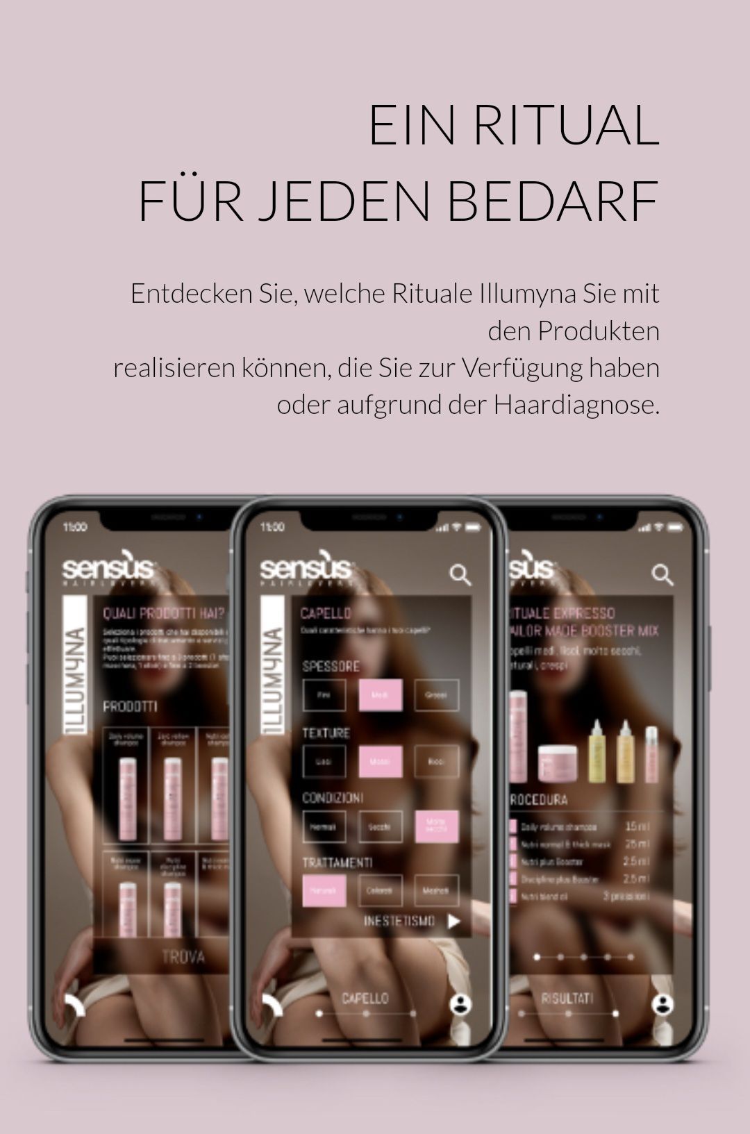 Laden Sie die Sensus App kostenfrei im App-Store herunter und entdecken Sie, welches Illumyna-Ritual speziell zu der Haar-Diagnose Ihrer Kundin durchgeführt werden kann.